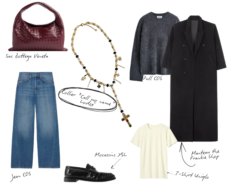 Un jean et un t-shirt, c'est clairement la base de tout dressing. Mais cette fois ce duo est associé à un pull gris et des mocassins pour créer Le look valeur sûre : simple efficace et légérement twisté avec le collier "call my name"