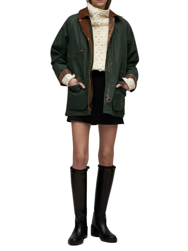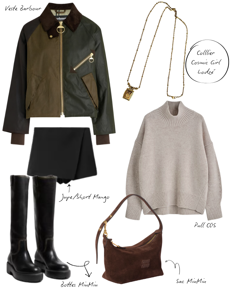 Veste Barbour - Pull COS - Jupe short Mango - Bottes Miu Miu - Pochette Miu Miu - Collier Lodzé