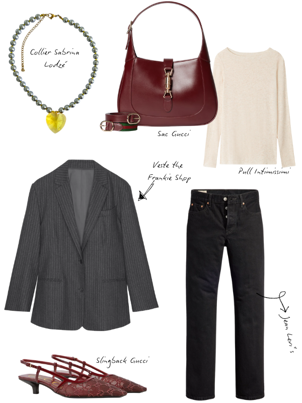 Blazer The Frankie Shop - Jean Levi's - Pull Intimissimi - Sac Gucci - Slingback Gucci - Collier Lodzé