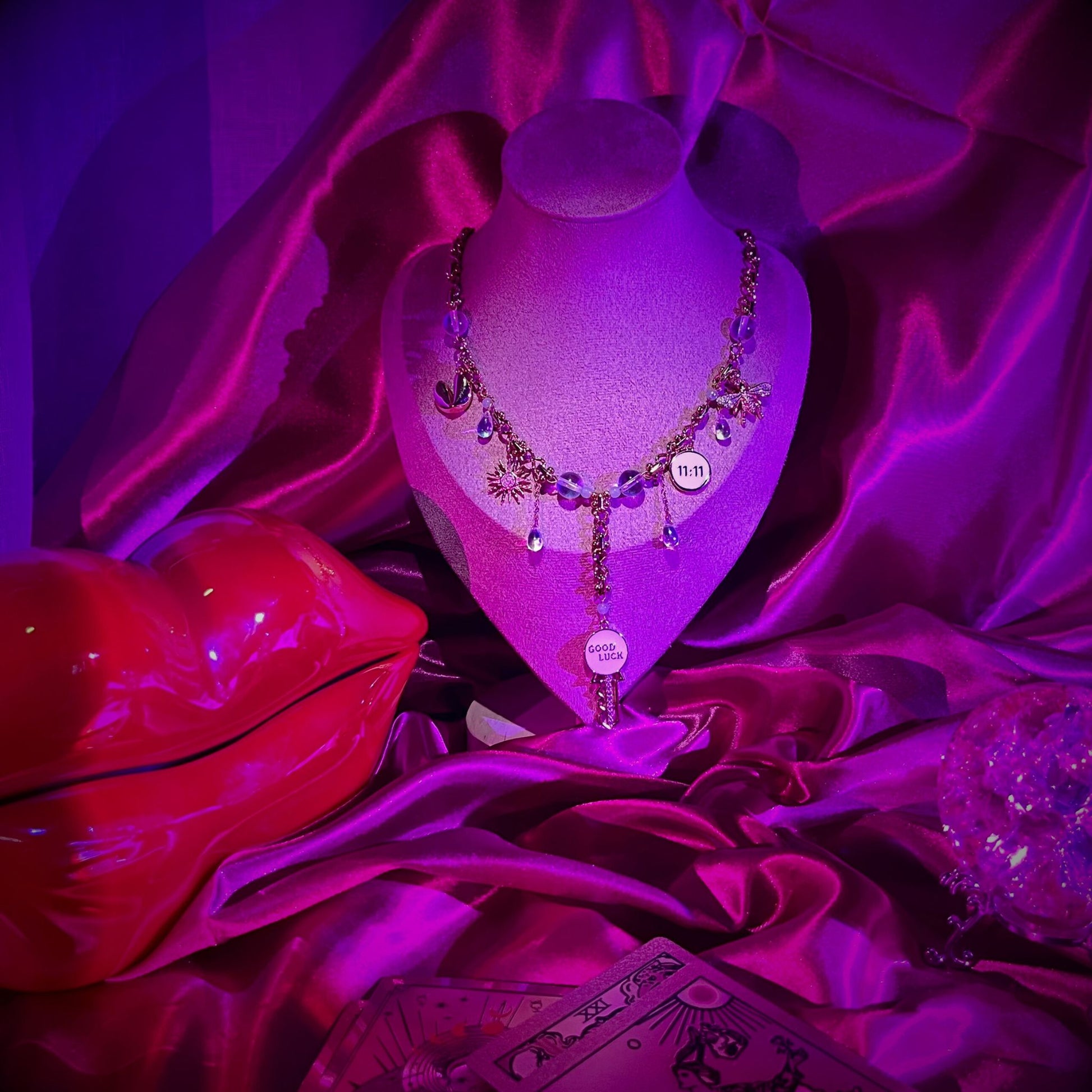 Ce collier forme Lariat est monté à la main avec des charms 100% good energy : une clé porte bonheur, une heure miroir, un fortune cookie et une abeille (signe d'abondance), j'ai imaginé ce collier comme une pièce qui t'apportera des bonnes ondes toute la journée ✨