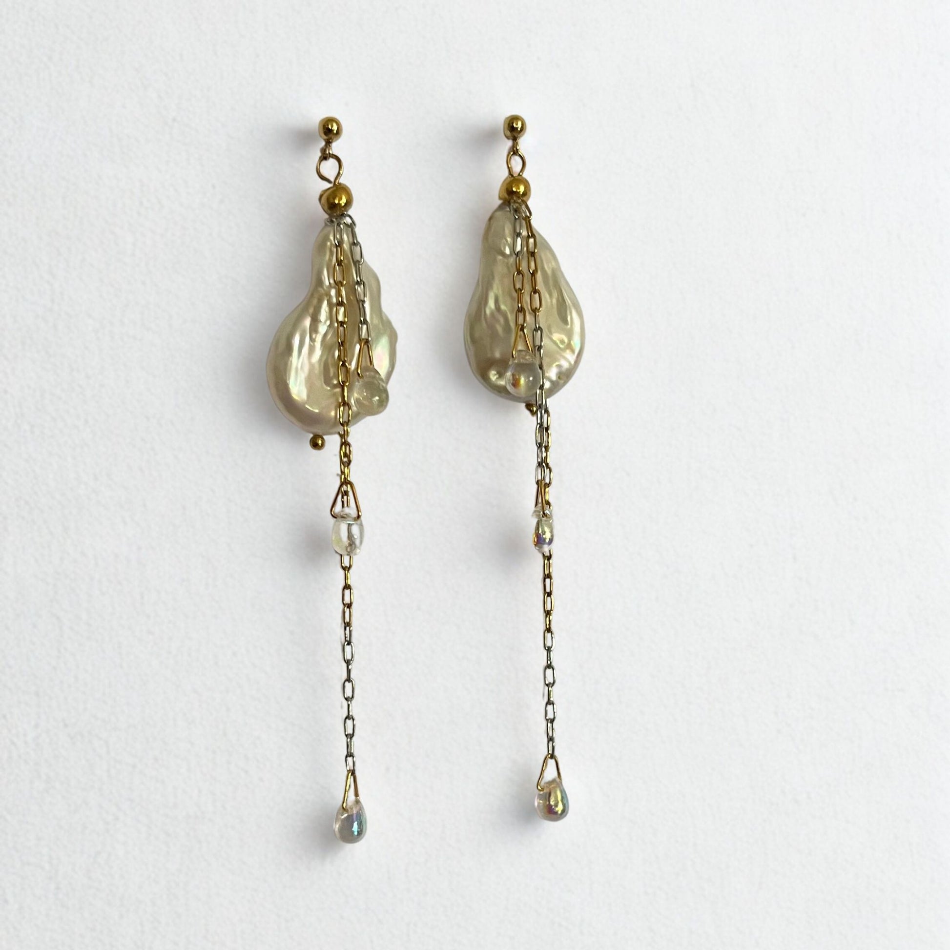 • Boucles d'oreilles en: perles de culture, chaînes et tiges en acier inoxydable, attaches et bélières en plaqué or, perles "larmes" en verre irisé.